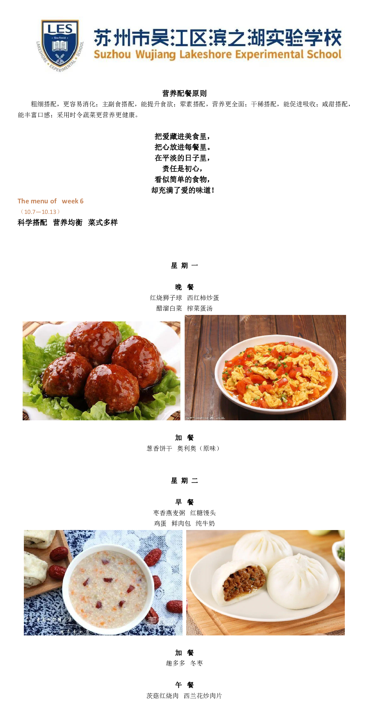 Menu for week 6 | 滨之湖实验学校美味食谱