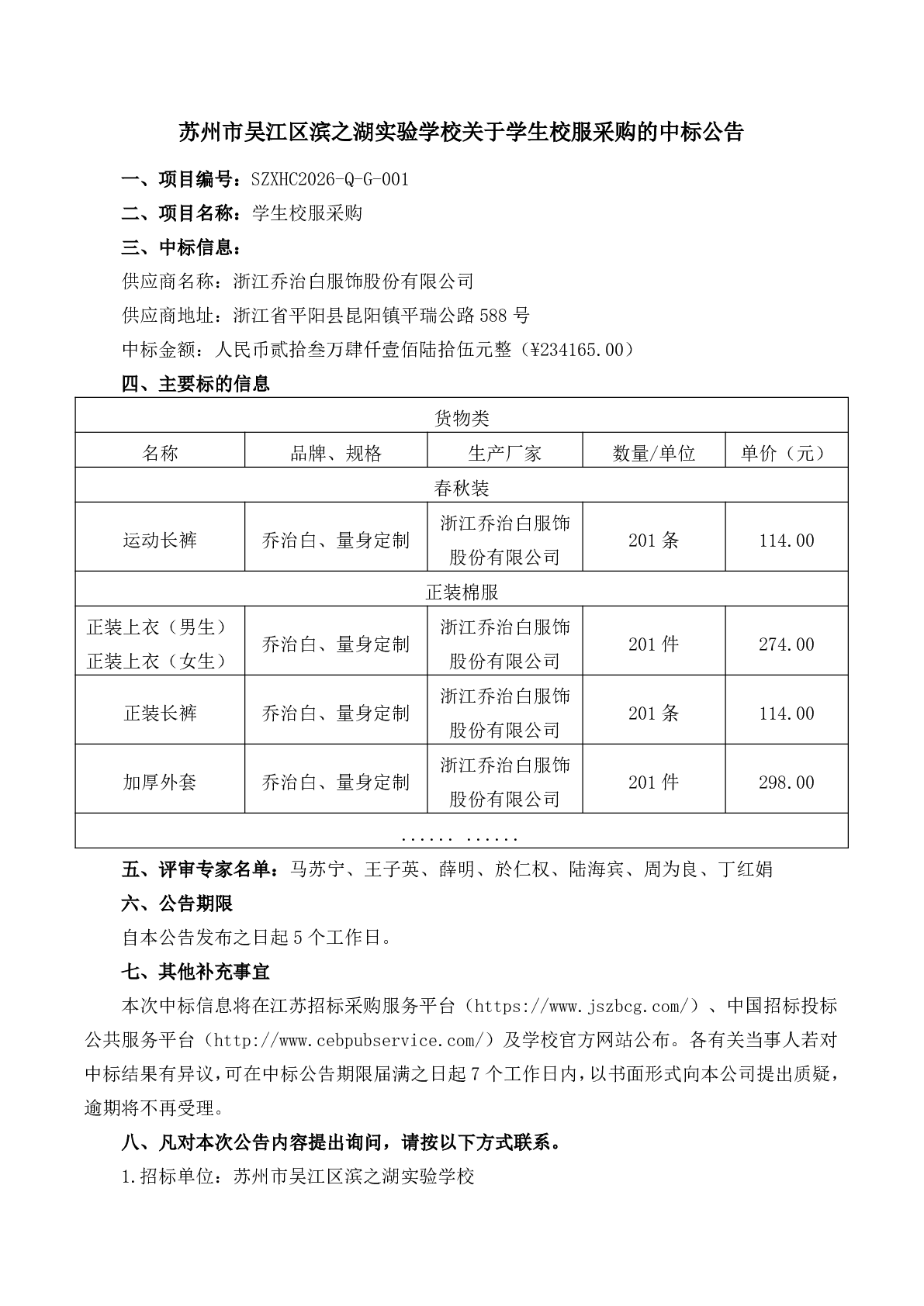 苏州市吴江区滨之湖实验学校关于学生校服采购的中标公告